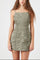 A woven mini dress featuring an allover ruched toggle drawstring design, straight-cut neckline and back, fixed cami straps, back crisscross detailing, and bodycon silhouette.