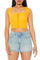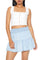 A woven crop top featuring shoulder straps, scalloped lace trim, a square-cut neckline and back, hook-and-eye front closures, corset-inspired design, and a crochet lace hem.