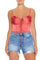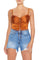 A satin cami featuring a sweetheart neckline, adjustable straps, straight-cut back, smocked back construction, bustier-inspired design, lace-up front closure, and scalloped lace hem.