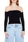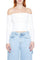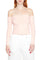 A sweater-knit top featuring an off-the-shoulder neckline, allover ribbed construction, self-tie closure at the chest, long sleeves, fitted silhouette, and a semi-cropped hem.