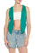 A woven vest featuring an open front, jetted front pockets, adjustable back strap with high-polish buckle, and pointed hem.