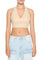 A knit crop top featuring a plunging halter neckline with button-loop closures and allover sequins.