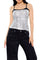 A knit cami featuring an allover ruched construction, partial metallic finish, two-tone design, picot trim, a straight-cut neckline and back, adjustable straps, and a semi-cropped hem.