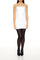 A Ponte knit mini dress featuring rhinestone box chain trim, a straight-cut neckline and back, adjustable cami straps, concealed zipper back closure, and bodycon silhouette.