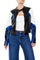 A faux leather moto jacket featuring an allover colorblock design, striped trim, flat collar, zip up and button-front closure, long sleeves with zippered cuffs, and cropped hem.