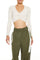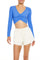 An athletic knit crop top featuring a ribbed construction, V-neckline, ruched front design, long sleeves, notched hem, fit that sculpts, lifts, and smooths, breathable and moisture wicking fabric, and seams that lay flat for ultimate comfort.