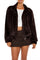 A faux fur bomber jacket featuring elasticized trim, a quilted channel-stitched construction, mock neck, concealed zip-up and snap button-front closure, slanted front pockets, and long sleeves.