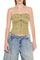 A woven tube top featuring a sweetheart neckline, exposed front zipper, front flap and welt pockets, front and back belt loops, and a cropped hem.