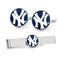 The perfect gift for the stylish baseball fan, the officially licensed Yankees Pinstripe Cufflink and Tie Bar Gift Set includes a pair cufflinks and a matching tie bar with the team's logo. If your everyday attire consists of a suit and tie, these MLB accessories are the finishing touch to elevate your style while supporting your New York Yankees. Officially licensed by the MLB.